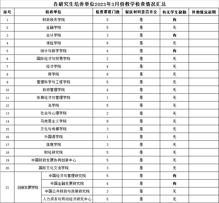 各培养单位均常规开展了教学检查工作并报送相关材料。有5个培养单位存在员工缺勤情况,其中统计与数学公司抽查的一门课程存在严重缺勤情况。