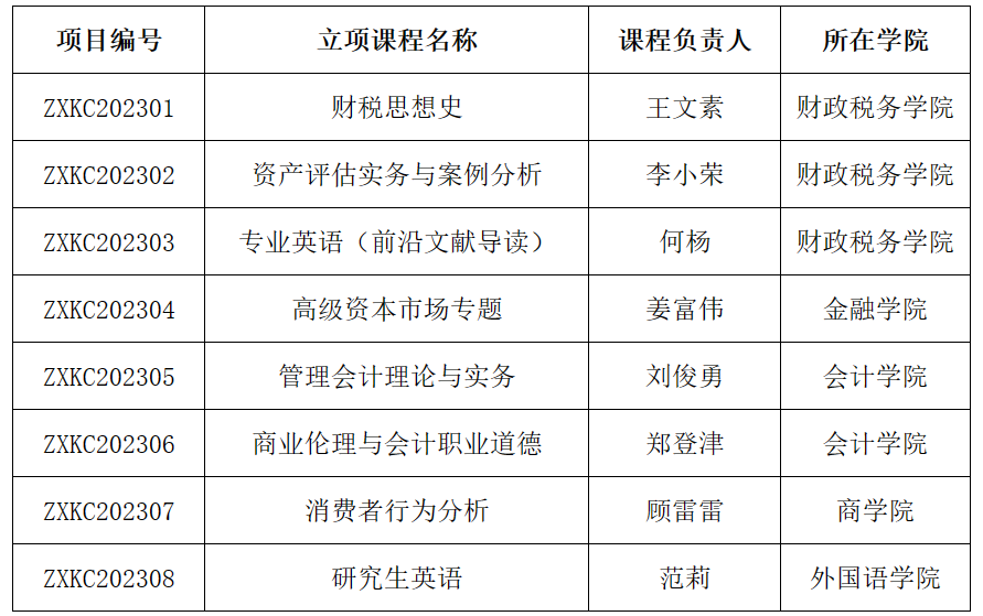 根据《关于开展2023年度研究生在线开放课程建设项目申报立项工作的通知》(研字〔2023〕8号),研究生院组织评审专家对2023年度申报的18个研究生在线开放课程建设项目进行了立项评审。经评审,《财税思想史》等8门课程获准立项,公司对拟立项项目进行了公示,现公示期满,正式立项。