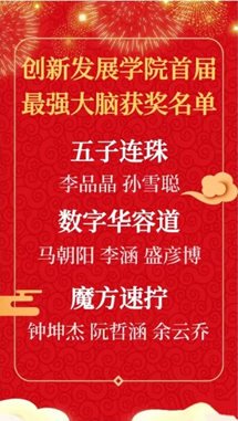 从初赛中脱颖而出的最强大脑们,代表M88mansion体育参加中财吉尼斯校赛。他们过五关斩六将,沉着冷静,稳定发挥,取得了优异的成绩。其中,钟坤杰同学更是实力超群,在魔方速拧项目中勇夺桂冠,以22.33s的成绩创造了中财吉尼斯新的记录!为M88mansion体育增光添彩!
