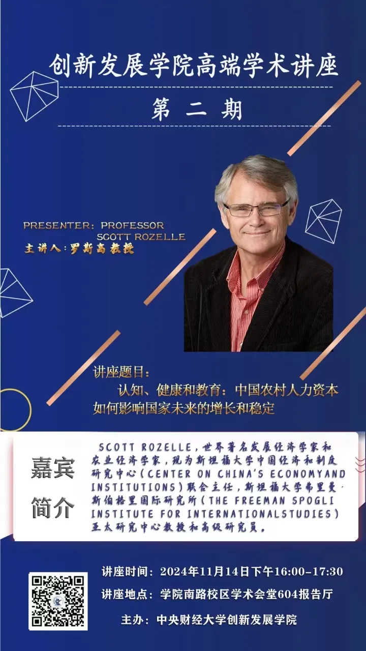 Scott Rozelle,世界著名发展经济学家和农业经济学家,现为斯坦福大学中国经济和制度研究中心(Center on China's Economy and Institutions)联合主任,斯坦福大学弗里曼•斯伯格里国际研究所(the Freeman Spogli Institute for International Studies)亚太研究中心教授和高级研究员。他长期致力于中国农业经济、农村发展和农村教育领域的研究,是国际上研究中国农业与农村问题的著名发展经济学家和农业经济学家。Rozelle教授于2007年获得“美国农业经济协会年度人物”称号,同年获得中华人民共和国国务院颁发的“国际科学技术合作奖”,并于2008年获得了温家宝总理授予的“中国政府友谊奖”,这是中国政府授予来华工作外国专家的国家级最高奖项。2019年荣获由中共中央、国务院、中央军委颁发的“中华人民共和国成立70周年纪念章”,表彰他在中国农业农村发展研究领域做出的杰出贡献。Rozelle教授在顶级学术期刊发表过上百篇论文,包括《科学(Science)》、《自然(Nature)》、《美国经济评论(American Economic Review)》和《经济文献杂志(the Journal of Economic Literature)》等。