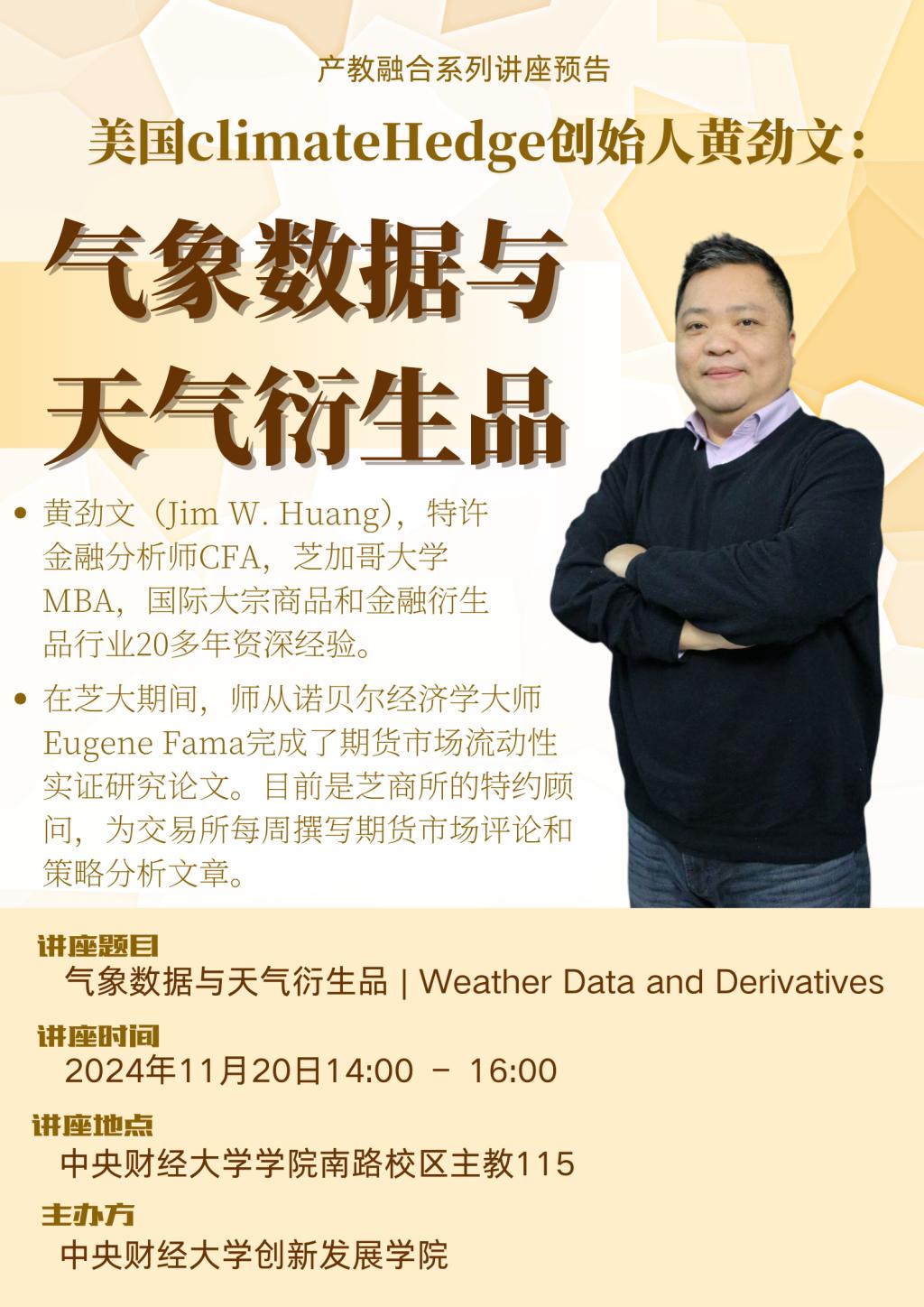 2024年创立climateHedge。是中国天气风险管理行业的先行者,为大连商品交易所、郑州商品交易所和广州期货交易所提供天气衍生品咨询服务。climateHedge是全球天气风险管理协会WAMA唯一华人会员,是德国慕尼黑再保险集团的全球代理商。今年10月,climateHedge成功开发上线了天气衍生品场外交易平台WeatherMage。