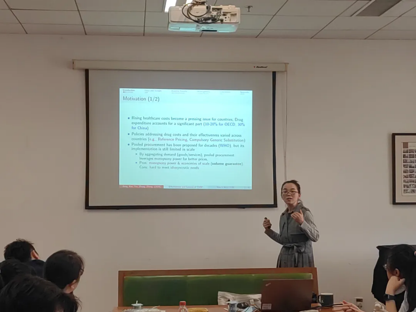 尹妮娜老师分享了自己的研究,介绍了全球处方药成本上升的背景下,各国应对该问题的政策差异。研究集中于分析中国规模最大的集中带量采购(CVBP)政策的成效,并借助来自全国医疗机构的丰富数据,通过分阶段双重差分的实证设计,揭示了该政策在降低药品价格和提高药品可及性方面的显著作用。研究显示,CVBP实施后,中标药品的价格平均下降67%,药品使用量增长了7.6%,总体药品支出则减少了70%。在市场份额方面,集中带量采购(CVBP)显著提高了中标仿制药的市场占有率,增幅达到50%,而品牌药品的市场份额则下降了12.8%。