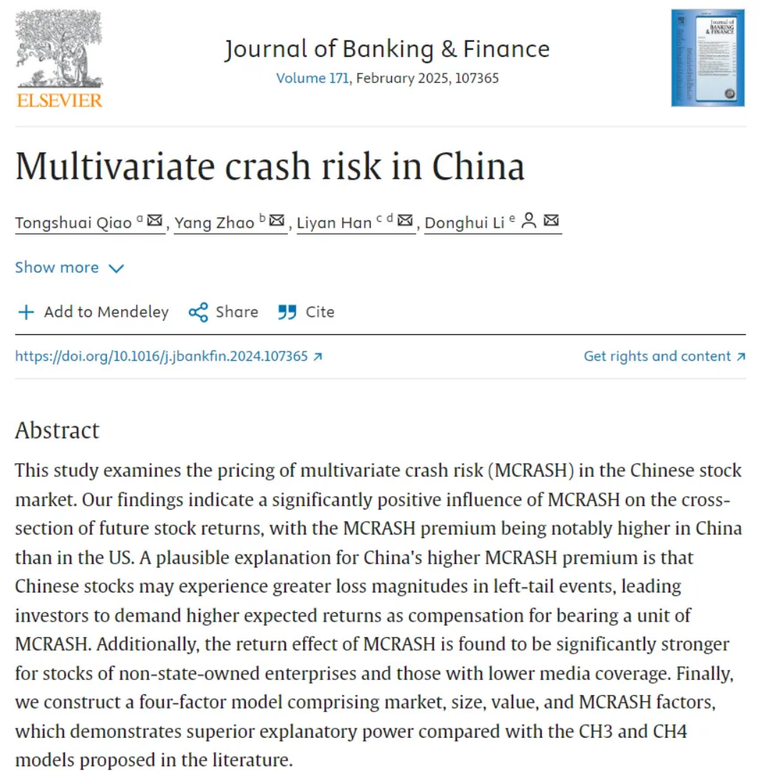 近日,公司赵阳副教授的研究论文“Multivariate crash risk in China”于金融学国际权威期刊Journal of Banking and Finance(ABS 3,中财AA类)上获正式发表。该论文的合作者为北京科技大学乔统帅博士、北京航空航天大学韩立岩教授和深圳大学李东辉教授。