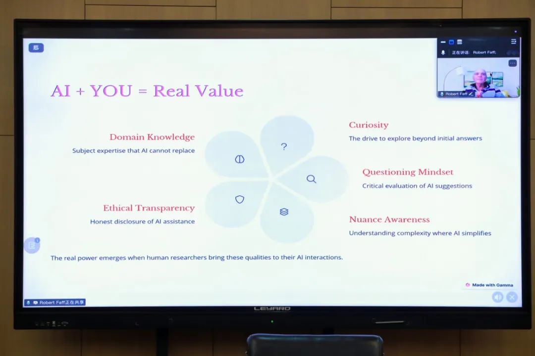 随后,PBFJ期刊主编Robert Faff教授通过线上方式作了题为“Responsible use of gAI in Research Matters”的主旨演讲。Faff教授深入探讨了生成式AI在学术研究中的负责任使用,强调AI应作为辅助工具,研究者需保持批判性思维与学术诚信,通过透明、深入和反思性的方式与AI协作,从而提升研究能力,推动学术创新。