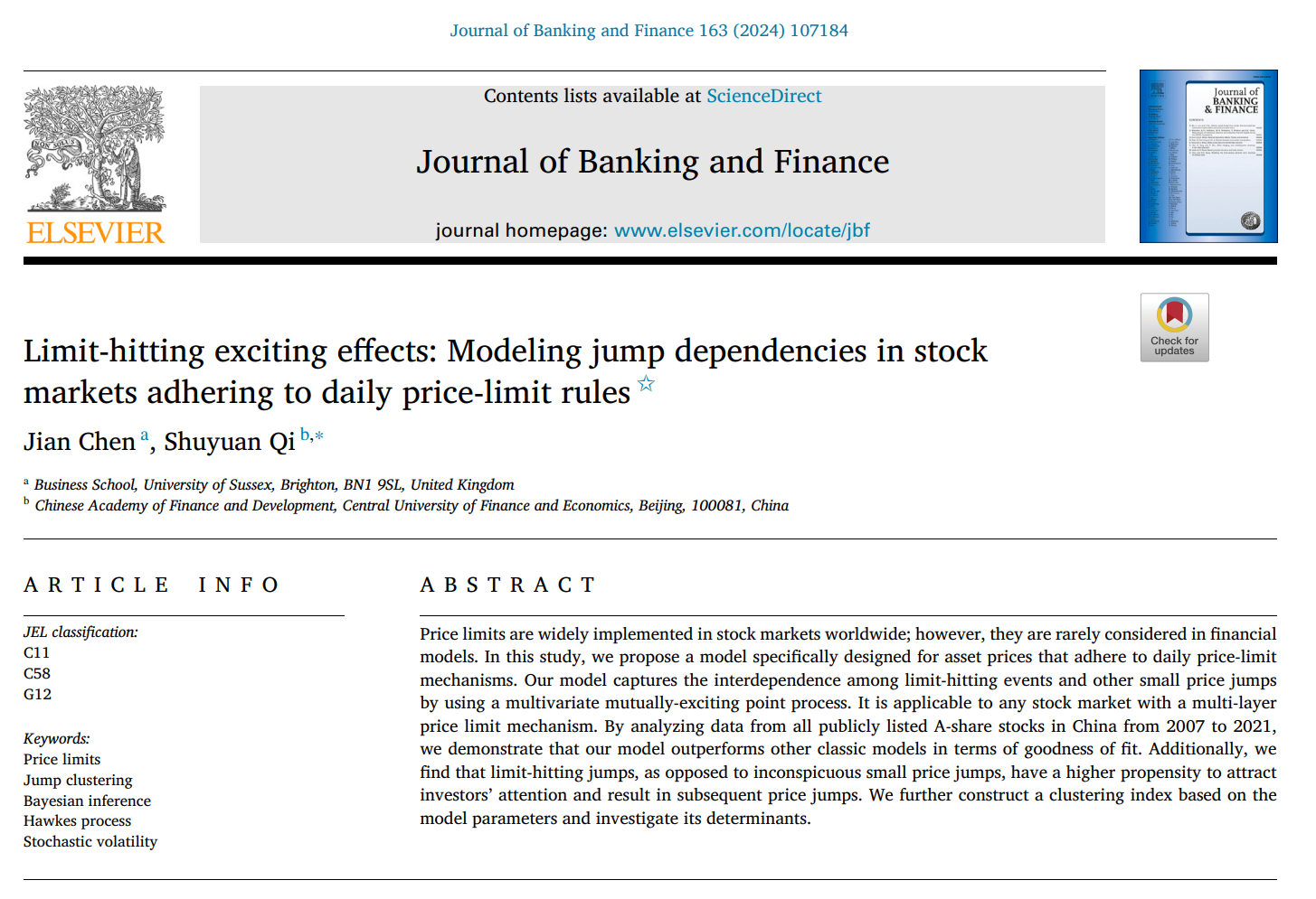 近日,公司戚书源助理教授与英国萨塞克斯大学商公司的陈健助理教授的合作论文“Limit-hitting exciting effects: Modeling jump dependencies in stock markets adhering to daily price-limit rules”于金融学权威期刊Journal of Banking and Finance(ABS 3,中财AA类)上获正式发表。本篇论文以中国金融市场的涨跌停机制为研究对象,创新性地提出了“触限激励效应(Limit-hitting exciting effects)”这一概念,该概念用于刻画股票价格因涨跌停事件而引发的后续跳跃现象。本研究构建了描述涨跌停机制和触限激励效应的模型,旨在对触限激励效应进行深入探究,并对其进行精确量化分析。通过此项研究,有望更深入地理解涨跌停制度对股票价格动态的影响,从而为金融市场的稳定与发展提供有益的参考。