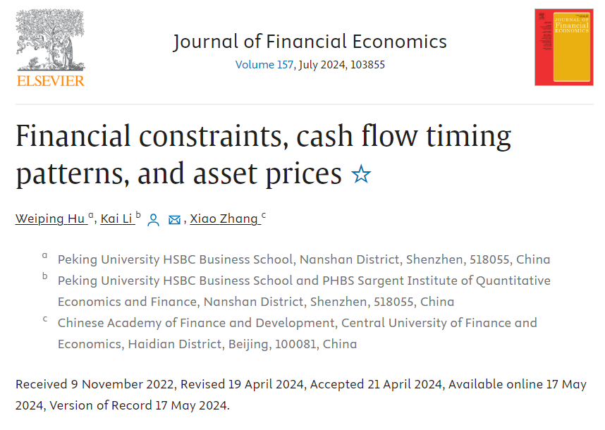 日前,公司张潇副教授合作论文“Financial Constraints, Cash Flow Timing Patters, and Asset Prices”(《财务约束,现金流回收时机和资产价格》)在Journal of Financial Economics发表(中财AAA类,ABS4+, UTD24)。该研究探讨了融资约束对经营性现金流回收时机的影响,以及其相应的公司融资政策和资产定价方面的推论。论文合作者为北京大学汇丰商学经理聘副教授李凯和2023级博士生胡伟平。