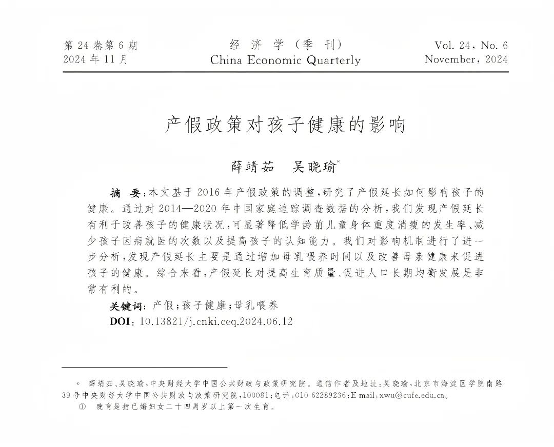更多信息可查看原文:薛靖茹、吴晓瑜,“产假政策对孩子健康的影响”,《经济学(季刊)》,2024年第6期,第1901-1919页。