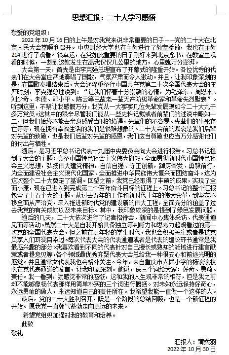 通过直播观看了党的二十大开幕盛况,聆听、学习了党的二十大报告,倍受鼓舞。对此,我更加坚定了一个信念,那就是必须毫不动摇地坚持中国共产党的领导,坚持走中国特色社会主义政治发展道路。充分发挥一颗小小螺丝钉的作用,在服务的本职岗位上不断改进服务态度,提升服务水平,尽己所能,帮助新老同志解决实际问题,努力办一些为民实事,做一些利民好事。