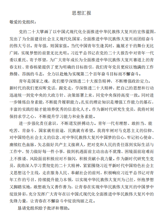作为一名预备党员,我也积极对党的二十大精神进行学习,更加坚定了要忠于党、忠于人民、无私奉献的信念,以高标准严格要求自己,切实承担起合格党员应尽的责任义务。同时面对未来,面对挑战,不忘初心,继续前进,为中国人民谋幸福,为中华民族谋复兴,为实现中华民族伟大复兴切实奉献自己微薄的力量。