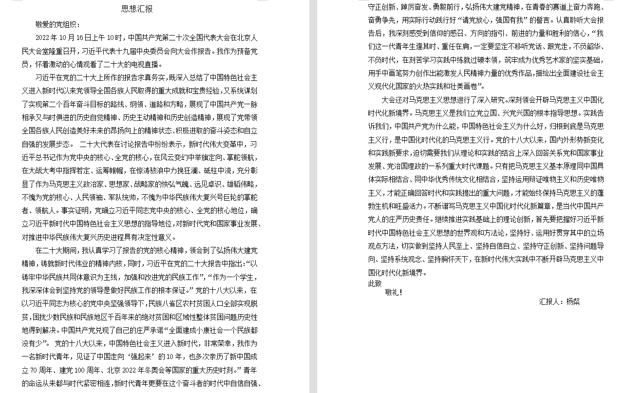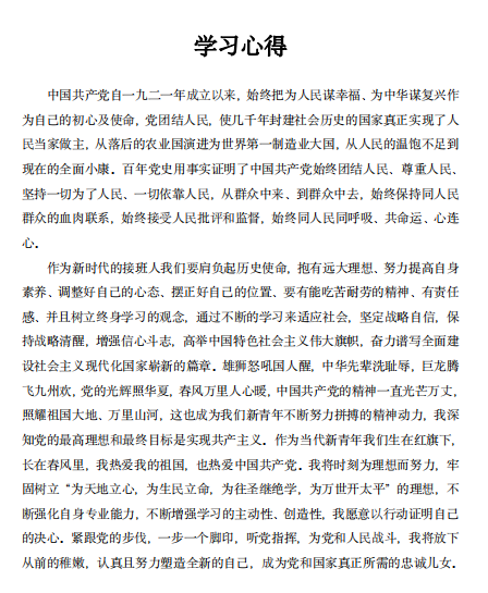 作为当代中国青年,成长过程中我有幸在这些年亲身经历目睹了国家的飞速发展,中华民族的经济腾飞,自己的生活也得到改善,可以说这是每一名中国人的幸福。中国特色社会主义是实现中华民族伟大复兴的必由之路,团结奋斗是中国人民创造历史伟业的必由之路,因此每一名中国人都应该携起手来,共同建设好我们的祖国。我坚信中国共产党必定能带领中国走向更美好的未来,实现中华民族伟大复兴!