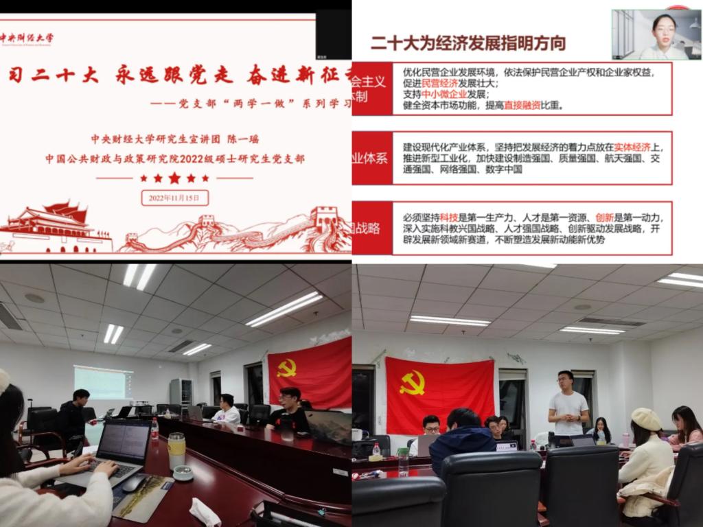为深入学习、准确领会、全面贯彻党的二十大精神,加强支部思想政治建设,提升支部成员整体素质,发挥支部先锋模范作用,10月至11月,M88mansion体育中国公共财政与政策研究院2022级硕士研究生党支部开展“两学一做”系列学习活动,将理论学习与实践相结合,在支部内外掀起了“学做并举”的热潮。