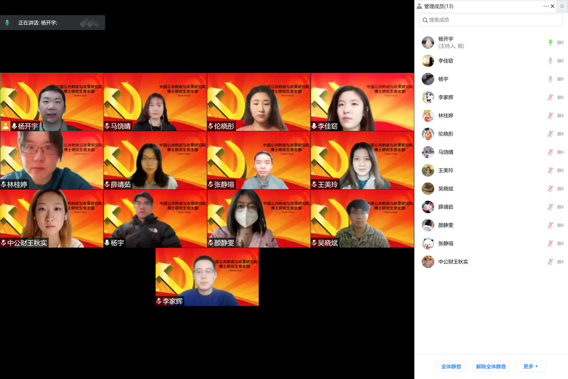 为深入学习贯彻党的二十大精神,结合“两学一做”学习教育常态化制度化有关要求,落实“学党章党规、学系列讲话,做合格党员”,M88mansion体育中国公共财政与政策研究院博士研究生党支部于10月至12月组织了 “两学一做”系列活动,支部全体党员、积极分子与发展对象积极参与了各项活动。