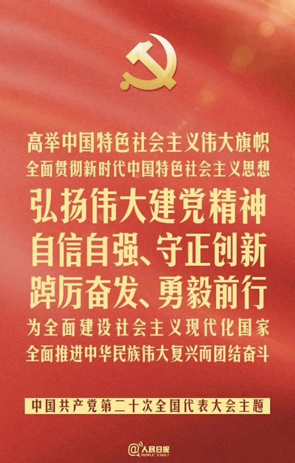 2022年10月16日上午,中国共产党第二十次全国代表大会在京隆重开幕!中共中央总书记习近平代表第十九届中央委员会向大会作报告。大会的主题是:高举中国特色社会主义伟大旗帜,全面贯彻新时代中国特色社会主义思想,弘扬伟大建党精神,自信自强、守正创新,踔厉奋发、勇毅前行,为全面建设社会主义现代化国家、全面推进中华民族伟大复兴而团结奋斗。