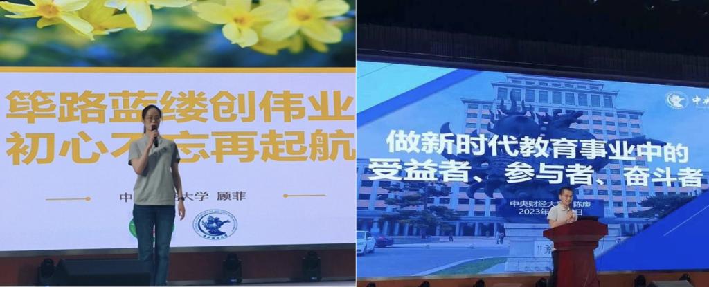 顾菲以“筚路蓝缕创伟业,初心不忘再起航”主题,分享了自己参与庆祝建党一百周年《伟大征程》文艺演出的经历,以及亲身感受到团结的力量,表示这种团结坚韧带领人民克服艰难的精神使她深受震撼,鼓励同学们艰苦奋斗,努力成为一代有理想、有本领、有担当的新时代青年。陈庚从新时代教育中的受益者、参与者、奋斗者角度出发,鼓励员工们珍惜眼下极为优越的教育资源,积极进取、努力拼搏。他以自身支教经历,勉励现场员工们培养吃苦奋斗的精神,并以“学习如逆水行舟,不进则退”“拳头缩回来,打出去才更有力度”两句话结尾,鼓励员工们保持积极向上的奋斗姿态,遇见困难时不要气馁,而是及时吸取经验、调整状态,再次将拳头用力打出,做一个奋斗者。