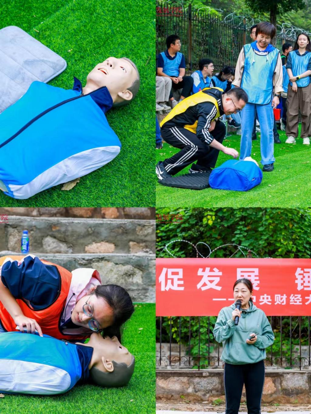 下午的活动从急救知识培训开始,校医院的大夫们为全体师生现场演示了心肺复苏、人工呼吸的正确操作流程,讲授了除颤仪的使用和在校园里的分布情况,普及了急救知识,纠正了一些常见误区。在场师生也踊跃参与模拟急救操作,通过实践巩固学到的急救知识,提升应变处理能力。