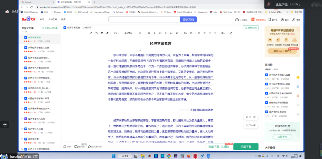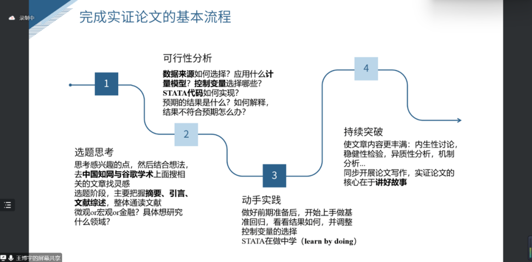 王博宇同学结合自己参加“挑战杯”员工课外学术论文竞赛的经历,向同学们分享了做学术研究的方法。他从完成实证论文的基本流程切入,详细列举了往年优秀作品的选题,为同学们提供了良好的选题思路。同时他按类别推荐了实证研究常用的数据库,丰富了大家获取数据的渠道。结合不同年级同学的知识储备情况,他解答了计量模型选择和STATA相关资源获取等方面的问题,并着重强调了论文写作的基本框架,为同学们今后的论文写作给出了建议。