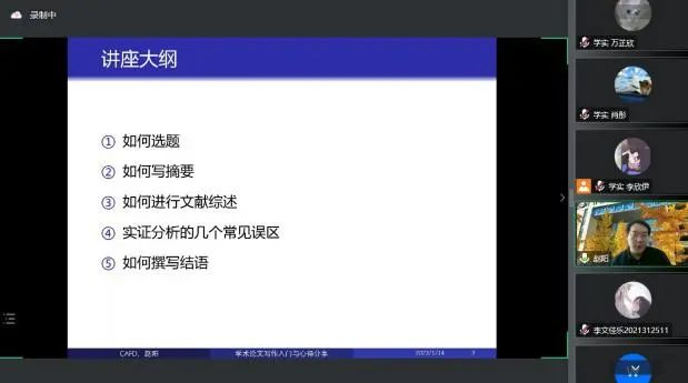 首先赵阳老师以当前金融领域的热点话题为引,引导同学们要立足于中国现实问题来确定选题,努力探索新视角和新方法,在具有明确的导向性的同时,也要正确评估自身现阶段的能力与水平,随后通过分享权威期刊高被引文献的摘要,对摘要写作的要点进行了全面剖析。在参考文献的选择和梳理方面,赵阳老师结合自身科研经历详细阐述了如何进行文献的总结梳理,并从中挖掘不足之处和创新点。在为同学们解答实证研究基本范式和若干误区后,赵阳老师着重强调了结语在整篇文章中的重要作用,建议基于必要内容和可选内容两方面考量进行斟酌和撰写。