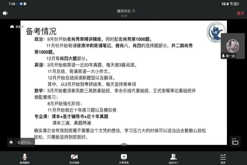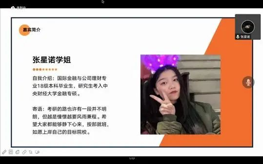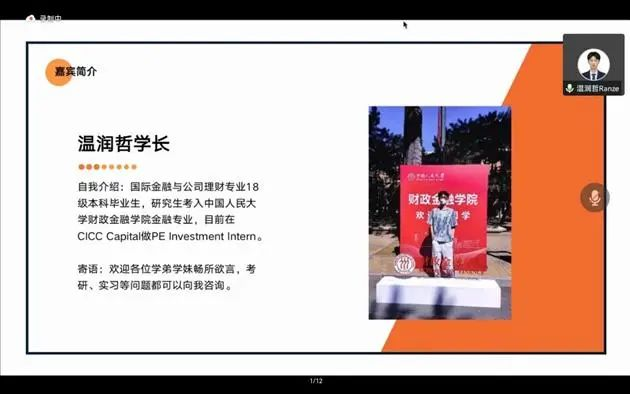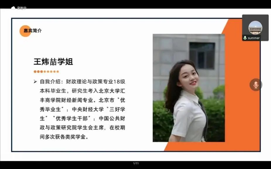 王炜喆(本科:财政理论与政策专业),研究生考入北京大学汇丰商公司财经新闻专硕。她详细讲述了自身选择跨考其他专业的理由与权衡,在解答同学问题的过程中,她谈及自己对母校的热爱,提醒同学们应珍惜本科时光,做好规划、努力提升自己。