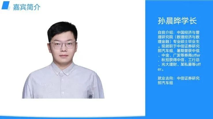 孙晨晔(数理经济与数理金融专业)现就职于中信证券研究部汽车组。他以自己的求职经历为例,重点分享了笔试、面试的技巧和注意事项,鼓励同学们在求职中要保持耐心与毅力。