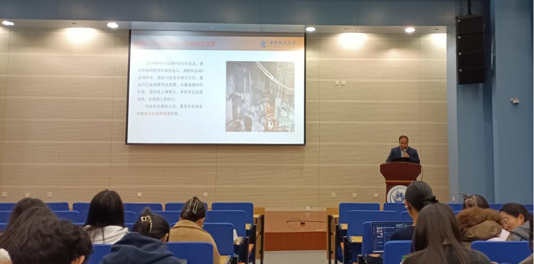 王其学老师以高校真实的火灾案例,警示同学们在可燃物密集的宿舍要格外注意用火安全,要规范使用电器,不乱接插线板,做到人走断电,严禁在床上吸烟,时刻牢记消防无小事。同时,针对校园内违规吸烟的问题,提醒大家要遵守吸烟规则,在指定吸烟点吸烟。为了让现场师生更好地掌握防范火宅、扑救初火的技能,王老师现场讲解、演示了灭火器、消火栓、火灾报警器等消防安全用品的使用方式,提醒校园内火场逃生要点,强调火灾中的自救和应变方法。