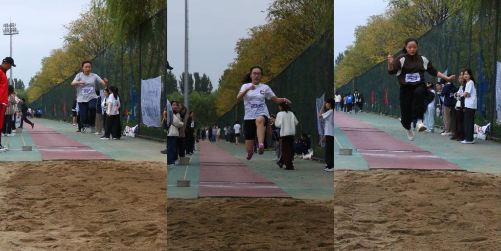 跳远项目不仅是纯粹的腿部力量博弈,而是对于运动员们起跑、跨步、跳远等动作一气呵成的考验。本次女子跳远项目创发由闫栩雯、黄子珊、黄静岩三名同学组队参赛。每位运动员努力拼搏,奋力起跳,达到了自己的最好。三位同学表现优异,黄静岩同学更是以3米67的优异成绩取得了女子跳远第三名!