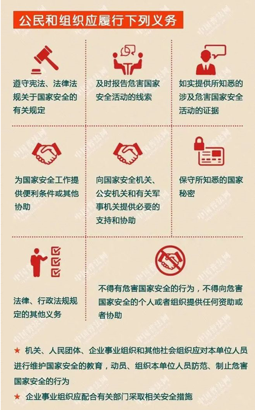 《国家安全法》将公民维护国家安全的义务与权利进行了法治化规定。《中华人民共和国国家安全法》第七十七条明确规定了公民在国家安全层面的义务: