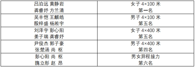 在女子4×400米项目中,刘泽宇、彭心阳、姜子瑞、龚睿妤超越身体极限,坚持到最后,荣获第五名的好成绩;在男子4×400米的跑道上,尹俊杰、郭子豪、张楚涵、尚枢全程冲刺,超越一个又一个对手,斩获第四名;在男女异程接力项目中,彭心阳、尚枢、隗立彤、赵昂相信队友,默契交接,最终以优异成绩获得第六名。