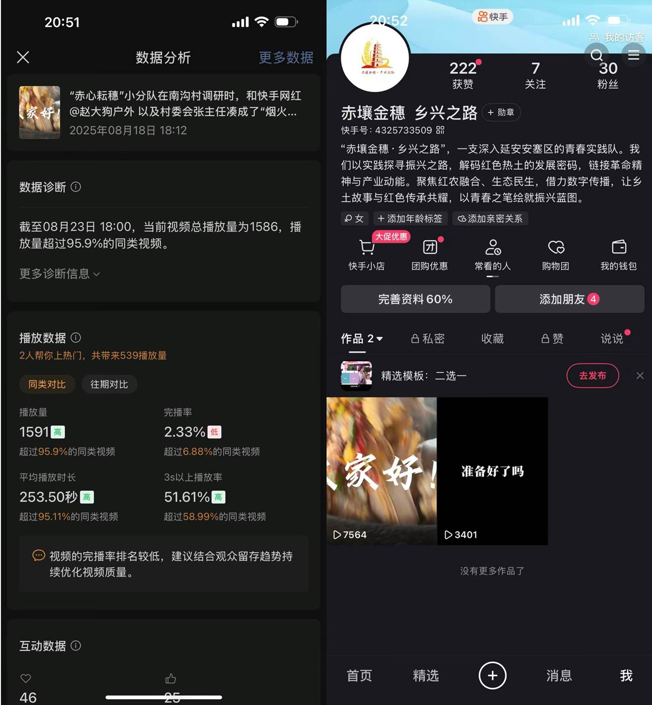 8月9日,实践团队与当地具有广泛影响力的快手网红主播“赵大狗”进行全天跟访与交流,深入了解了其通过短视频平台展现乡村生活的创作模式及运营方法。团队成员实际参与其日常拍摄流程,体验了新媒体内容生产与乡村实际劳动的结合路径。同时,团队成员与“赵大狗”合作拍摄了短视频《央财员工下乡记》,该视频于快手平台播放量超7500人次,各短视频平台累计播放量超一万人次,引发了网友的广泛关注与互动热议,为南沟村加大网络平台宣传力度的同时,有效提高其网络平台知名度。