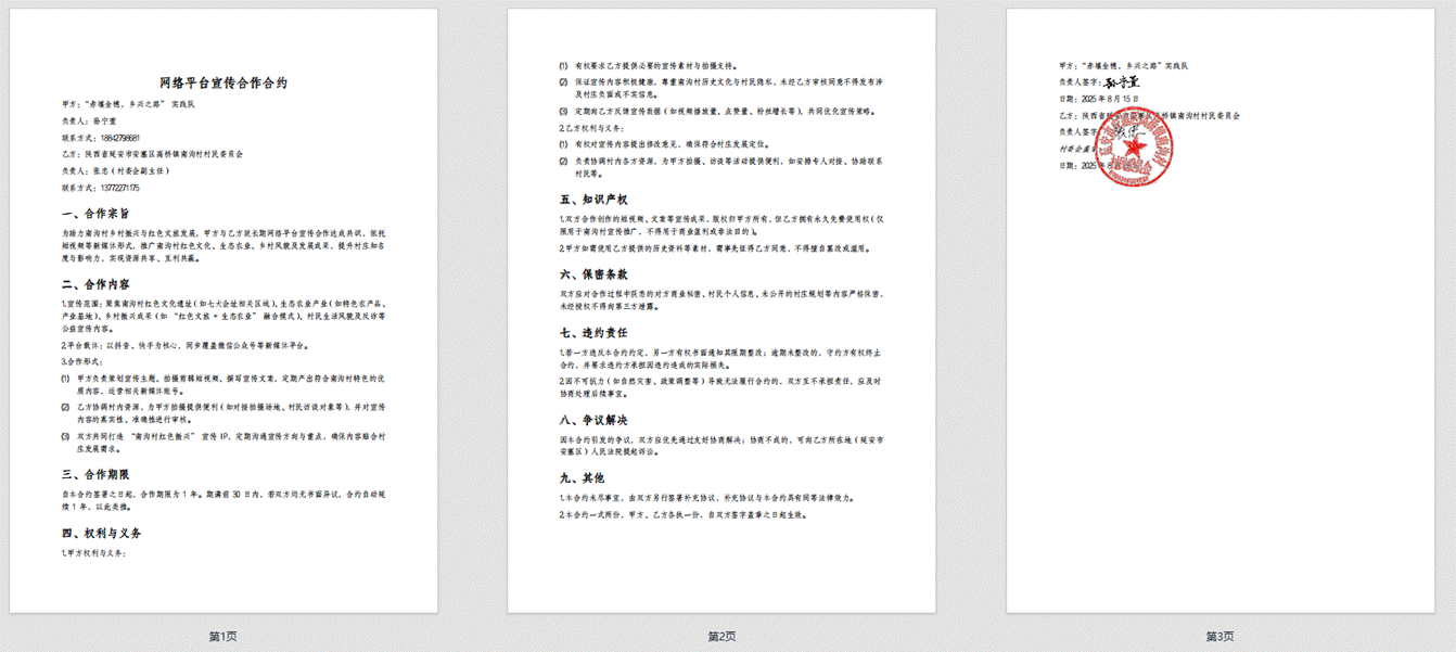 8月15日,实践团队与南沟村村委会正式签订《网络平台宣传合作合约》,明确以抖音、快手为主要渠道,策划并制作以推广南沟村红色文化、生态农业等为主题的多类短视频。此次合作旨在借助新媒体手段提升南沟村农产品的可见度和影响力,进一步探索“短视频+农业”赋能乡村发展的实践路径。