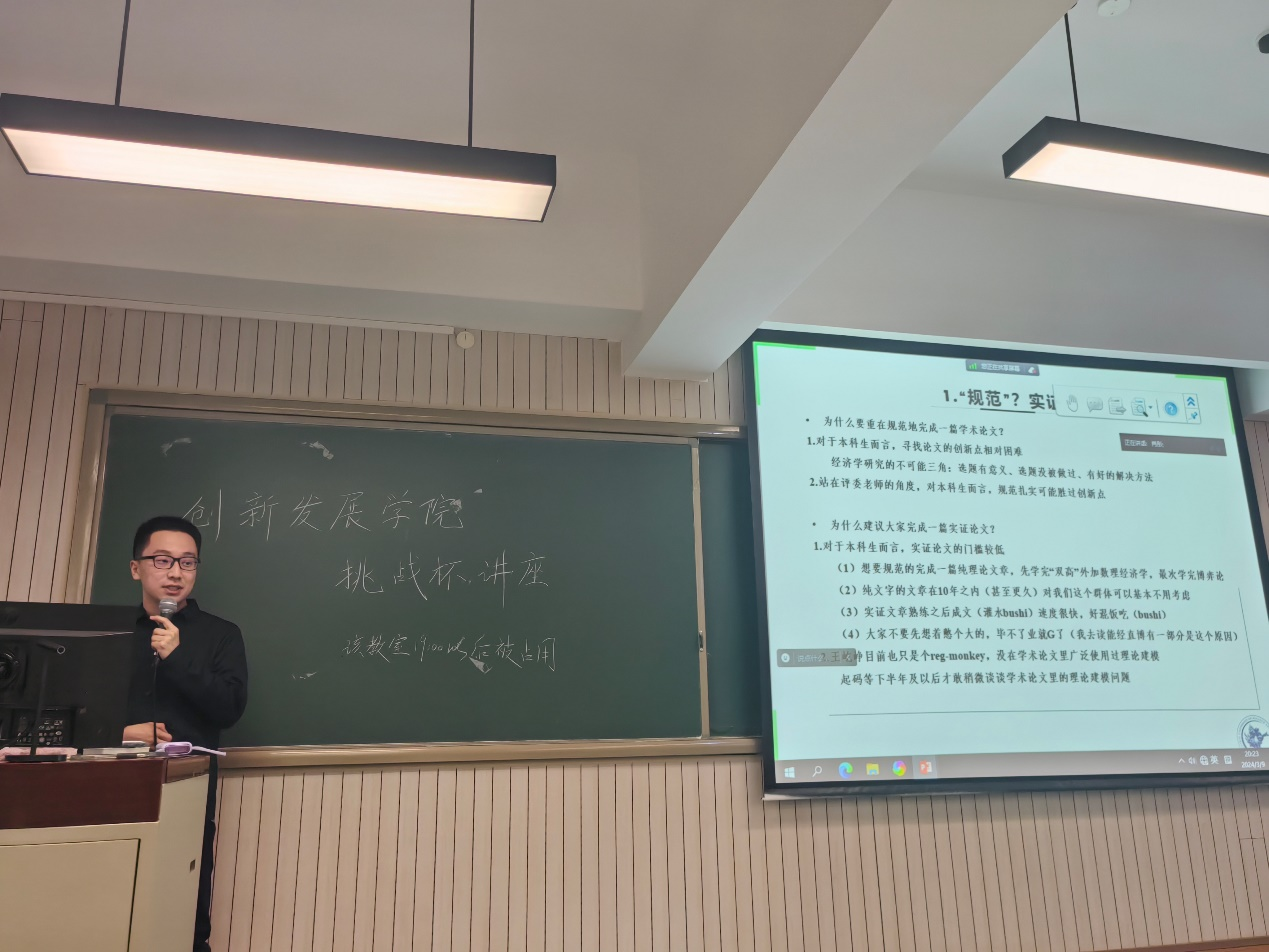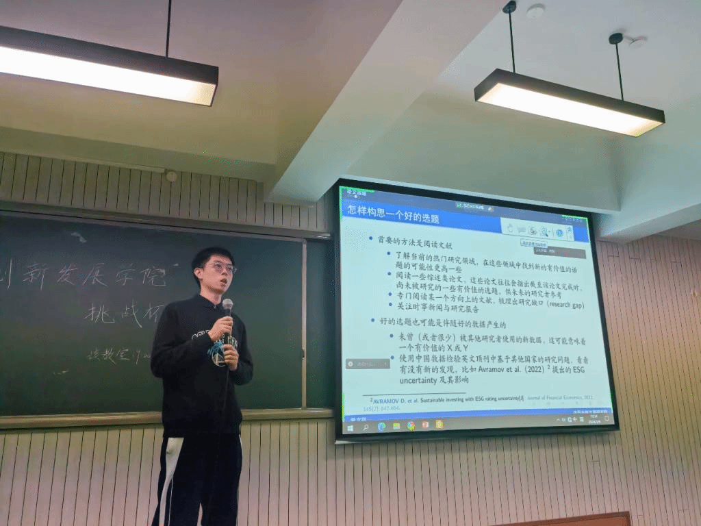 王屹峥结合切身经历,分享了本科生如何规范地完成一篇学术论文。他用幽默风趣的语言,介绍了一篇规范的实证论文的特点,并从选题、数据、实证等角度分享了规范完成论文的方法,最后通过具体例子讲解了梳理文献的三种精读方法。