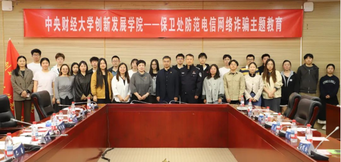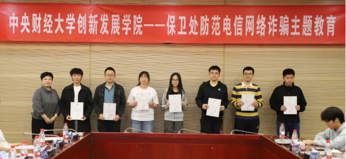 为培养员工的责任感,发挥员工骨干在反诈宣传中的积极作用,扩大反诈知识的覆盖面,公司组建成立“反诈先锋队”。会上,王颖书记为反诈先锋队代表颁发聘书,范维副处长为反诈先锋队授旗。公司反诈先锋队代表、经济学(数理经济与数理金融)22-2班冷昊辰宣读公司反诈公约,呼吁“反诈之路,始于点滴,无诈校园,从我做起”。