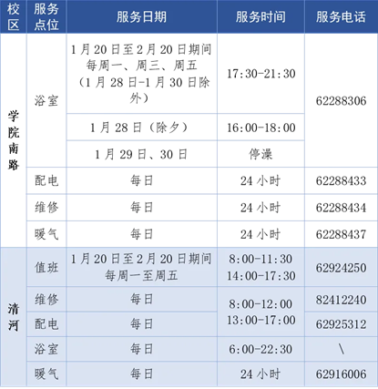2.寒假期间校医院实行24小时值班,其中除夕至大年初二停诊(1月28日至1月30日),大年初三早8:00恢复值班(1月31日),定期开放门诊。