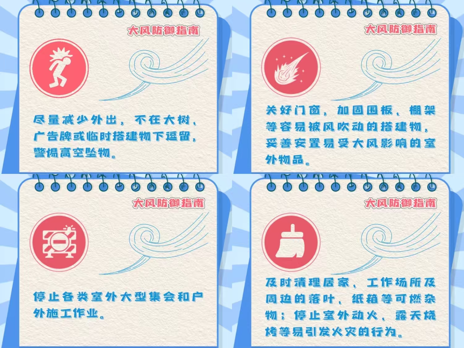 近日请避开外墙悬挂物、施工工地等区域;请查收以下大风天气使用防御指南: