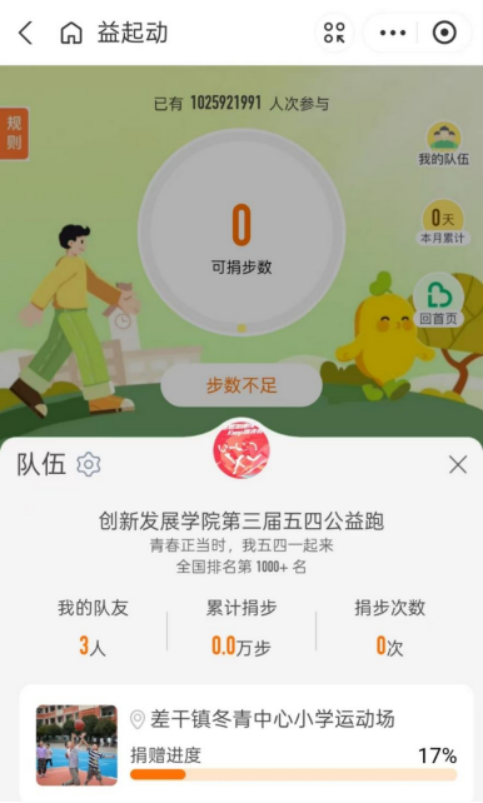 进入操场奔跑前,需来到操场打卡点登记参与时间和当前支付宝步数/Keep公里数,完成后需再次回到打卡点,确认完成后即可获得操场打卡点的印章。打卡点会提供运动需要的水、纸巾等必需品,还设有主题签名板,不要忘了留下你的足迹或对五四运动的感想哦!本次活动所积累的步数将在支付宝上进行捐赠,助力乡村公司拥有自己的田径场,为乡村振兴贡献自己的青春力量!