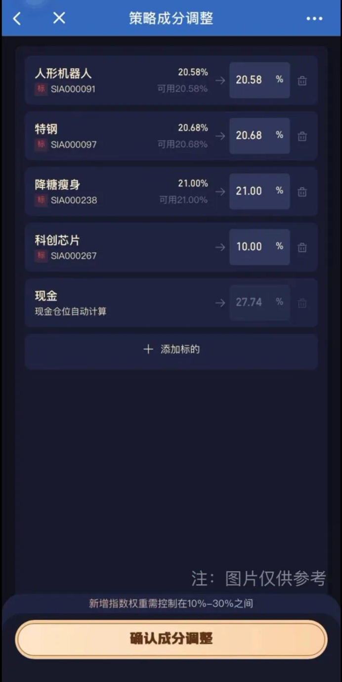 比赛开始后,参赛者每天有一次机会进行调仓,但账户中需至少保留1只指数,并且单只指数仓位限制在10%至30%之间。