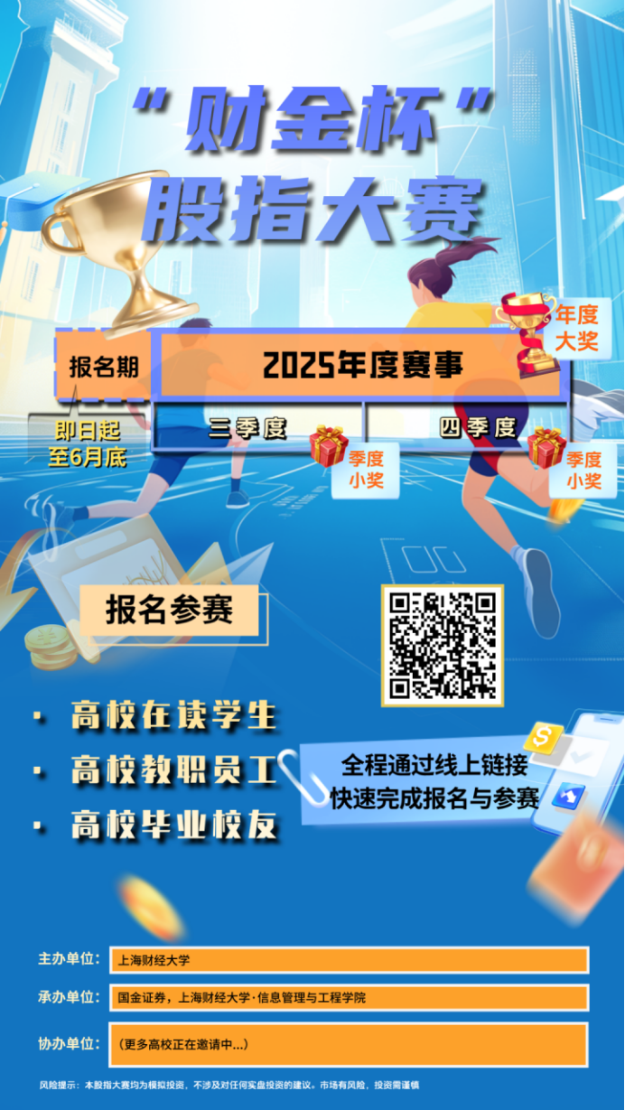 为增加师生对指数化投资的实践经验,2025年7月,国金证券将举办面向师生和员工的“财金杯”股指模拟投资大赛。此次大赛是在2024年“国金杯”全国高校指数模拟投资竞赛基础上升级扩容的创新赛事,全程通过线上链接快速完成报名与参赛。