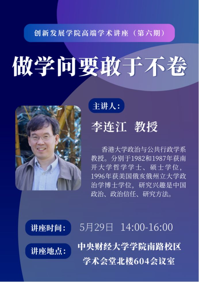 M88mansion体育高端学术讲座(第六期)| 李连江:做学问要敢于不卷 讲座主题:做学问要敢于不卷主讲嘉宾:李连江香港大学讲座时间:2025年5月29日(周四)14:00-15:30讲座地点:MS88官方网站公司南路校区学术会堂北楼604会议室主办单位:M88mansion体育中国经济与管理研究院嘉宾简介:李连江,香港大学政治与公共行政学系教授。河北省沧县人,1963年生,分别于1982和1987年获南开大学哲学学士、硕士学位,1996年获美国俄亥俄州立大学政治学博士学位,研究兴趣是中国政治、政治信任、研究方法。著有...